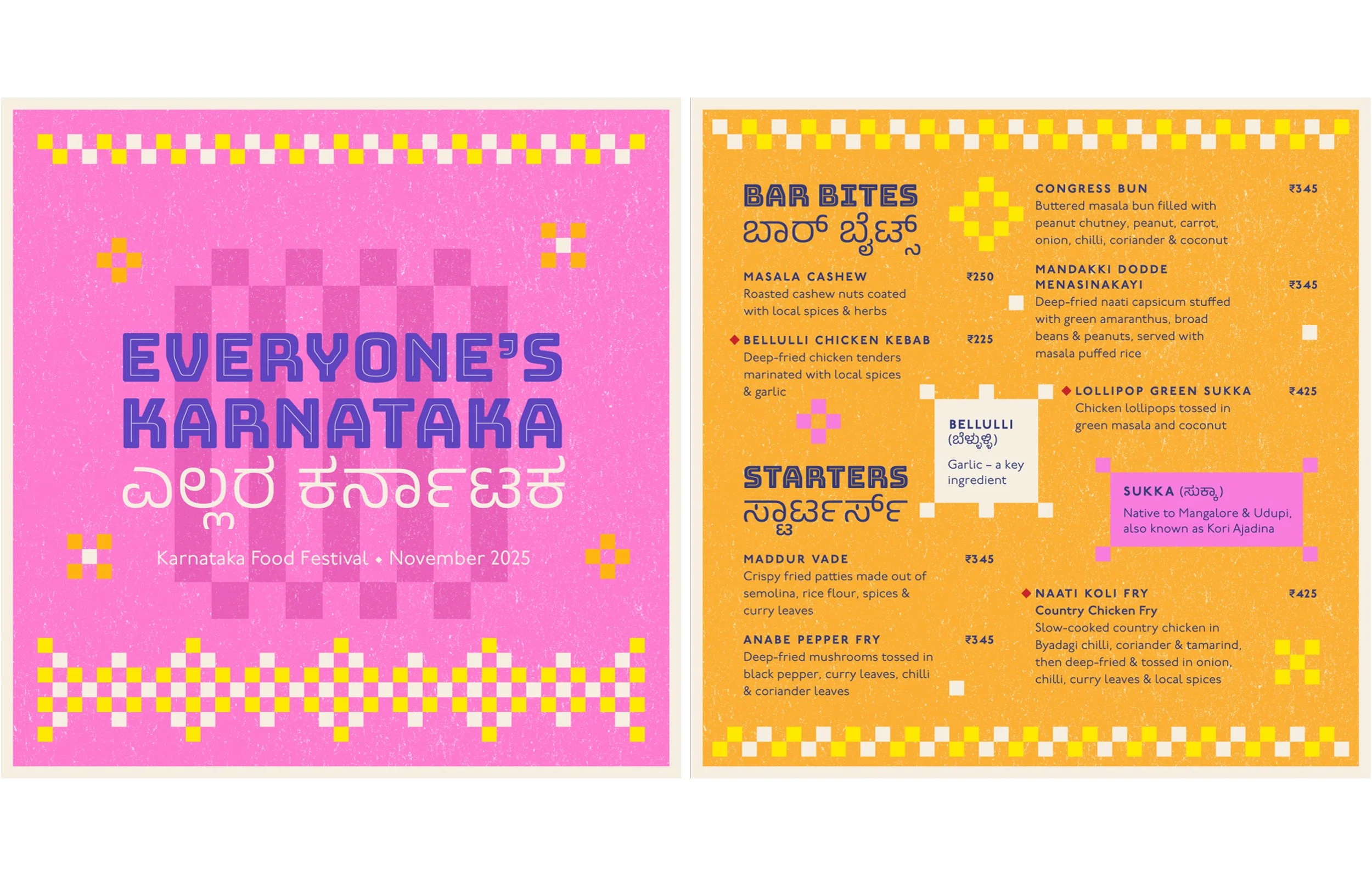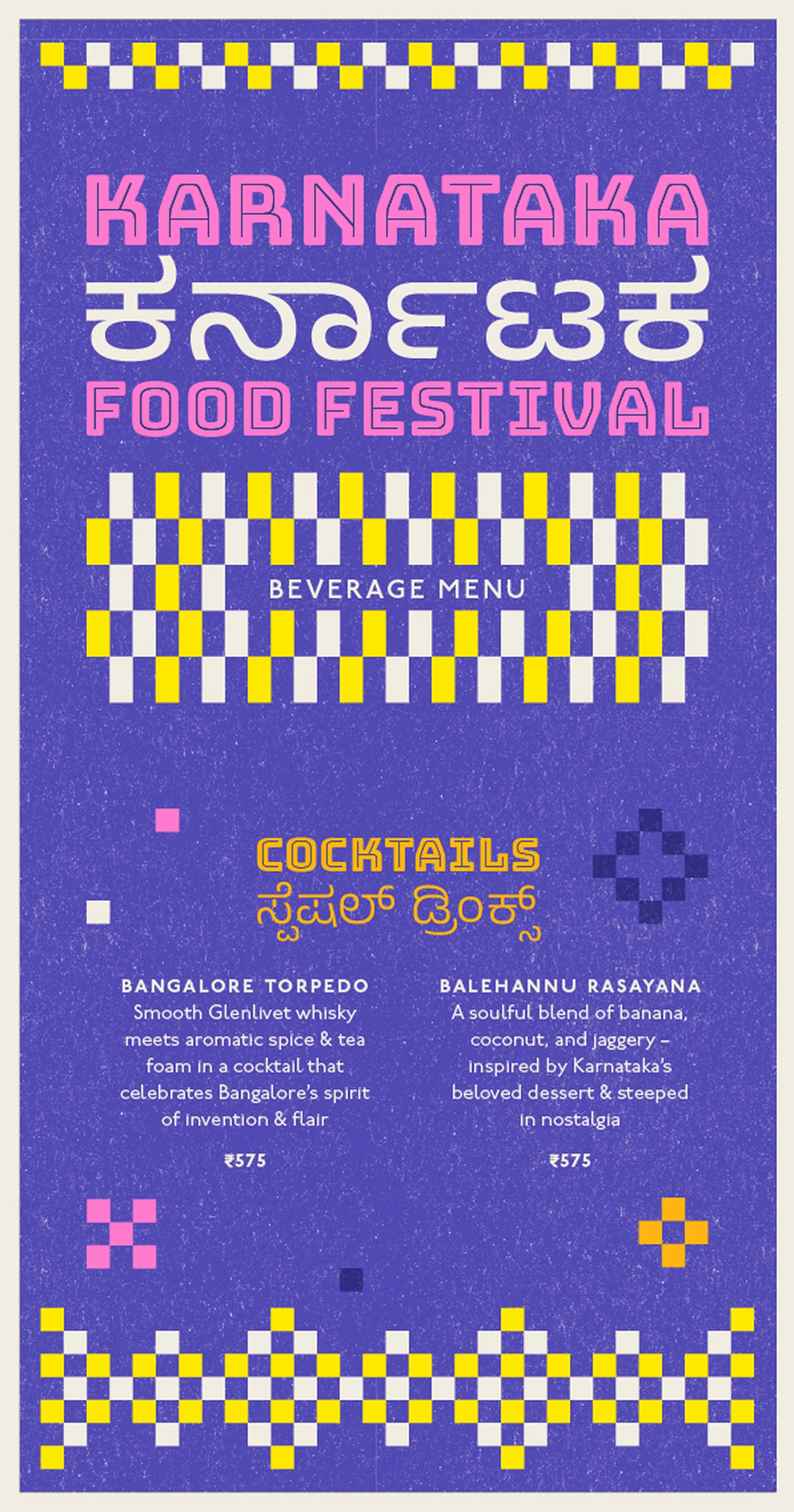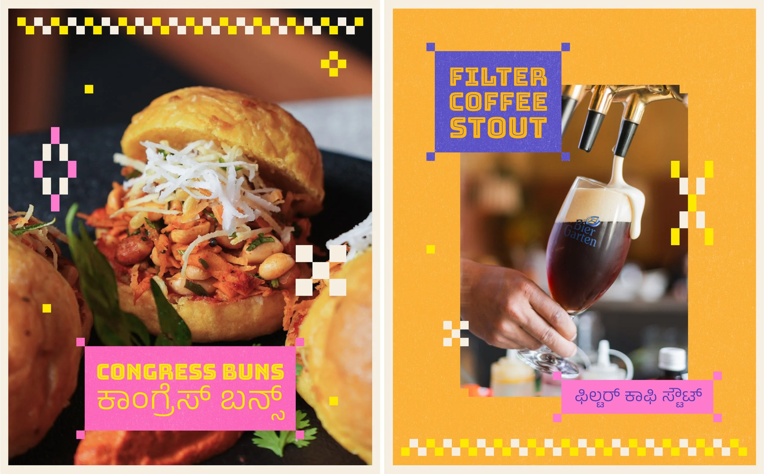 Every year, Biergarten Brewery & Kitchen celebrates the Karnataka Food Festival – a tribute to a state that’s a mosaic of accents, kitchens, playlists, and Friday-night pints. This year’s identity draws from the warmth of the Kowdhi quilt of North Karnataka; square patchworks of reused fabrics stitched into rhythmic geometry, paired with colours inspired by vibrant risograph inks and traditional quilts.