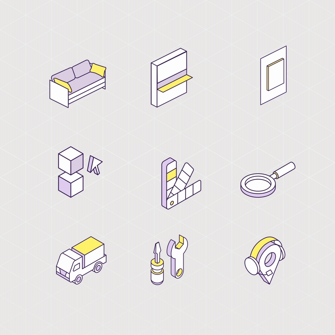 Illustrations were built on a 25° isometric grid to highlight the functionality of the offerings and add a sense of space and dimension. Folds and sharp corners became core brand elements, forming versatile design systems that could expand and adapt. These were thoughtfully integrated with negative space across applications to reinforce the brand’s central idea of creating space.